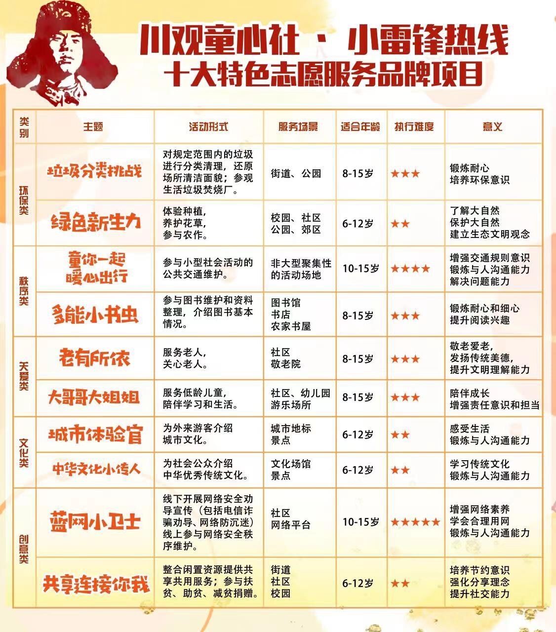启动仪式正式发布了“川观童心社·小雷锋热线”精心筹划设计的垃圾分类挑战、老有所依、城市体验官等十大特色志愿服务品牌项目,系列活动将充分发挥媒体优势,对学校、社区、机构开展的志愿服务进行宣传推广,整合公共资源,带动更多人、更多机构参与到学雷锋志愿服务实践中来。