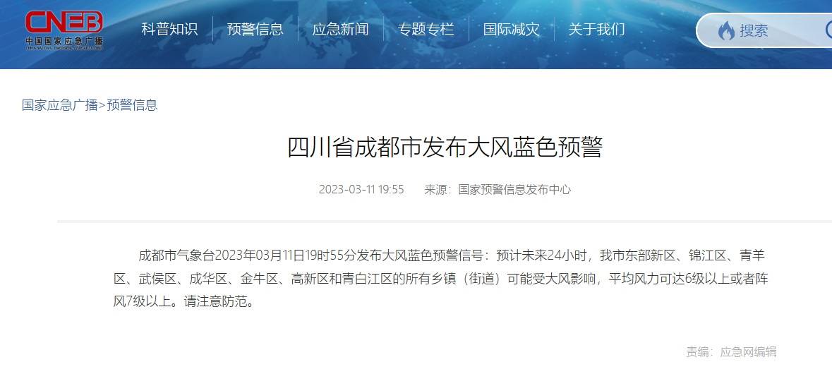 据国家预警信息发布中心消息,成都市气象台2023年03月11日19时55分发布大风蓝色预警信号:预计未来24小时,成都市东部新区、锦江区、青羊区、武侯区、成华区、金牛区、高新区和青白江区的所有乡镇(街道)可能受大风影响,平均风力可达6级以上或者阵风7级以上。请注意防范。