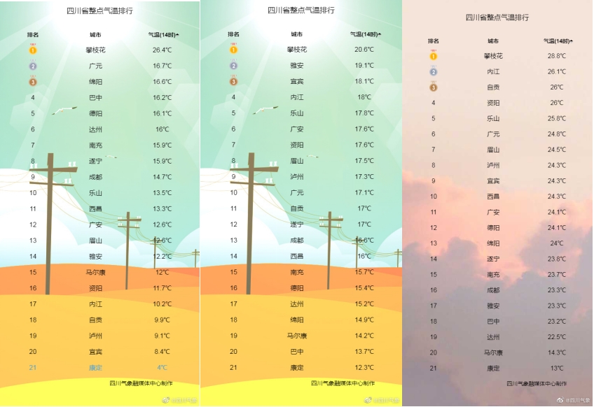 四川各地3月13日14时(中)实况气温较3月12日14时(左)气温明显回升。右图为3月11日14时四川各地实况气温。图片来源:四川气象微博