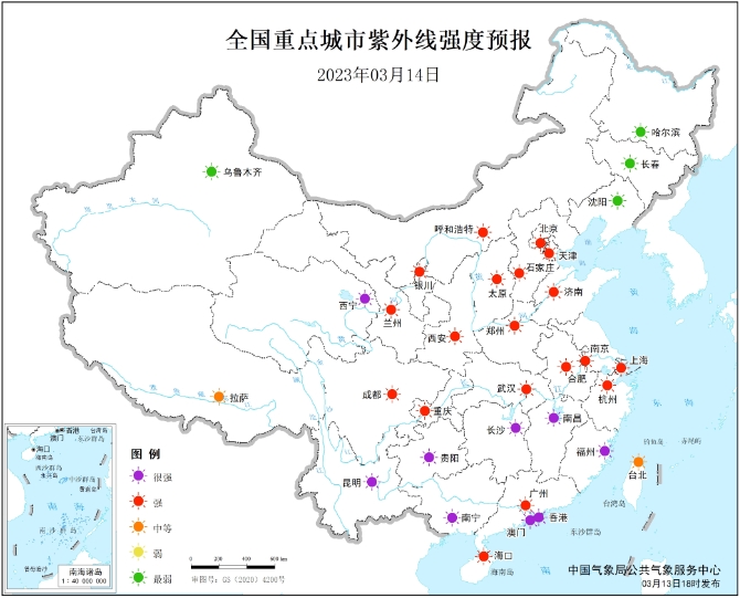 另外,中国气象局公共气象服务中心3月13日18时发布健康气象预报:预计明天中午前后,西南地区大部紫外线强度强,局部地区紫外线强度很强。建议:外出时适当采取一些防护措施,如:戴好遮阳帽、太阳镜、太阳伞,涂擦防护霜等;强紫外线区域,中午前后避免外出,或尽可能在遮荫处,以防阳光过敏,或灼伤皮肤;很强紫外线区域,尽可能不在室外活动。