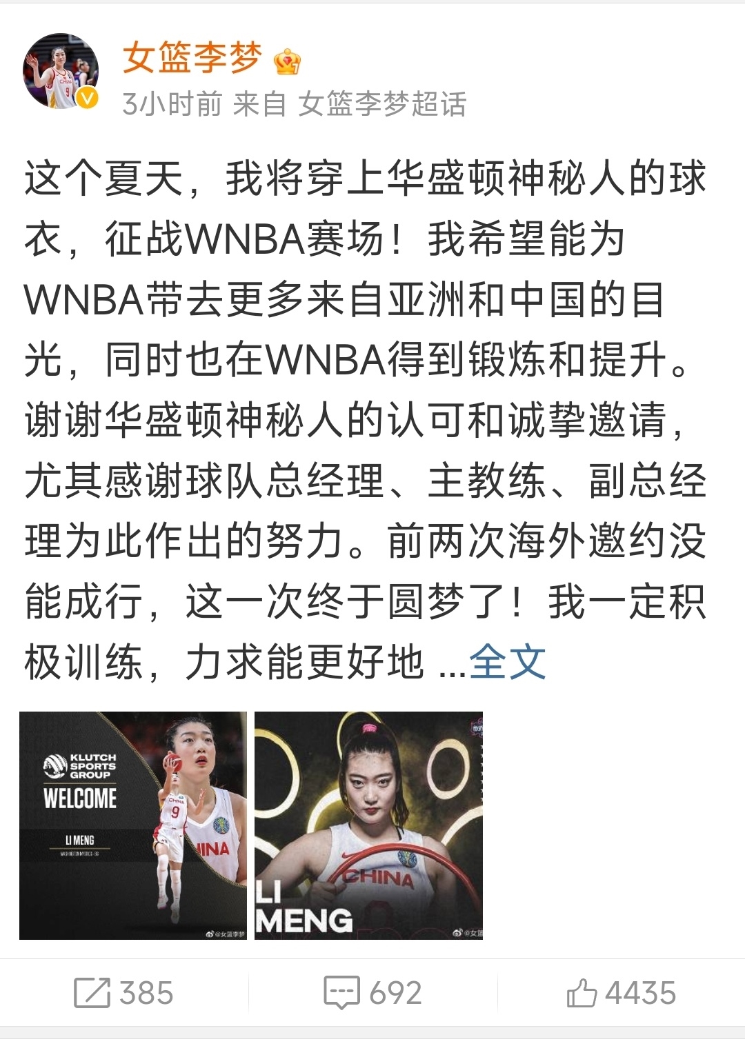 李梦写道:“这个夏天,我将穿上华盛顿神秘人的球衣,征战WNBA赛场!我希望能为WNBA带去更多来自亚洲和中国的目光,同时也在WNBA得到锻炼和提升。”