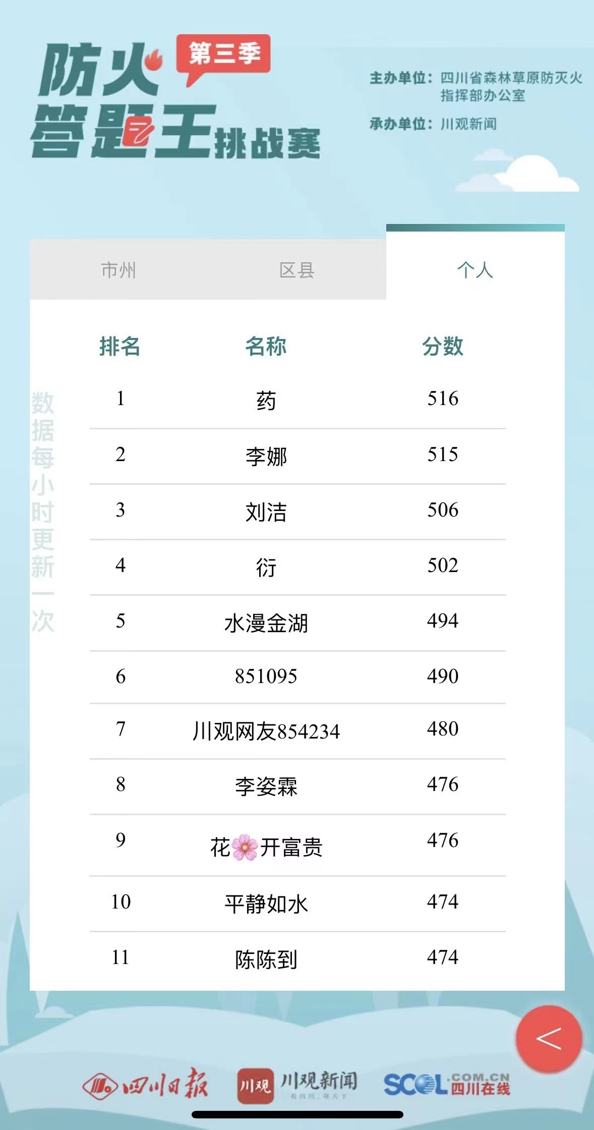 相较市州、区县榜单,个人榜表现相对稳定。川观网友“药”“李娜”交替出现在第1名的位置上;川观网友“刘洁”“衍”则在激烈争夺季军的位置。距离挑战赛结束还有不到30天,究竟谁才是最后的防火“答题王”?你能猜到吗?