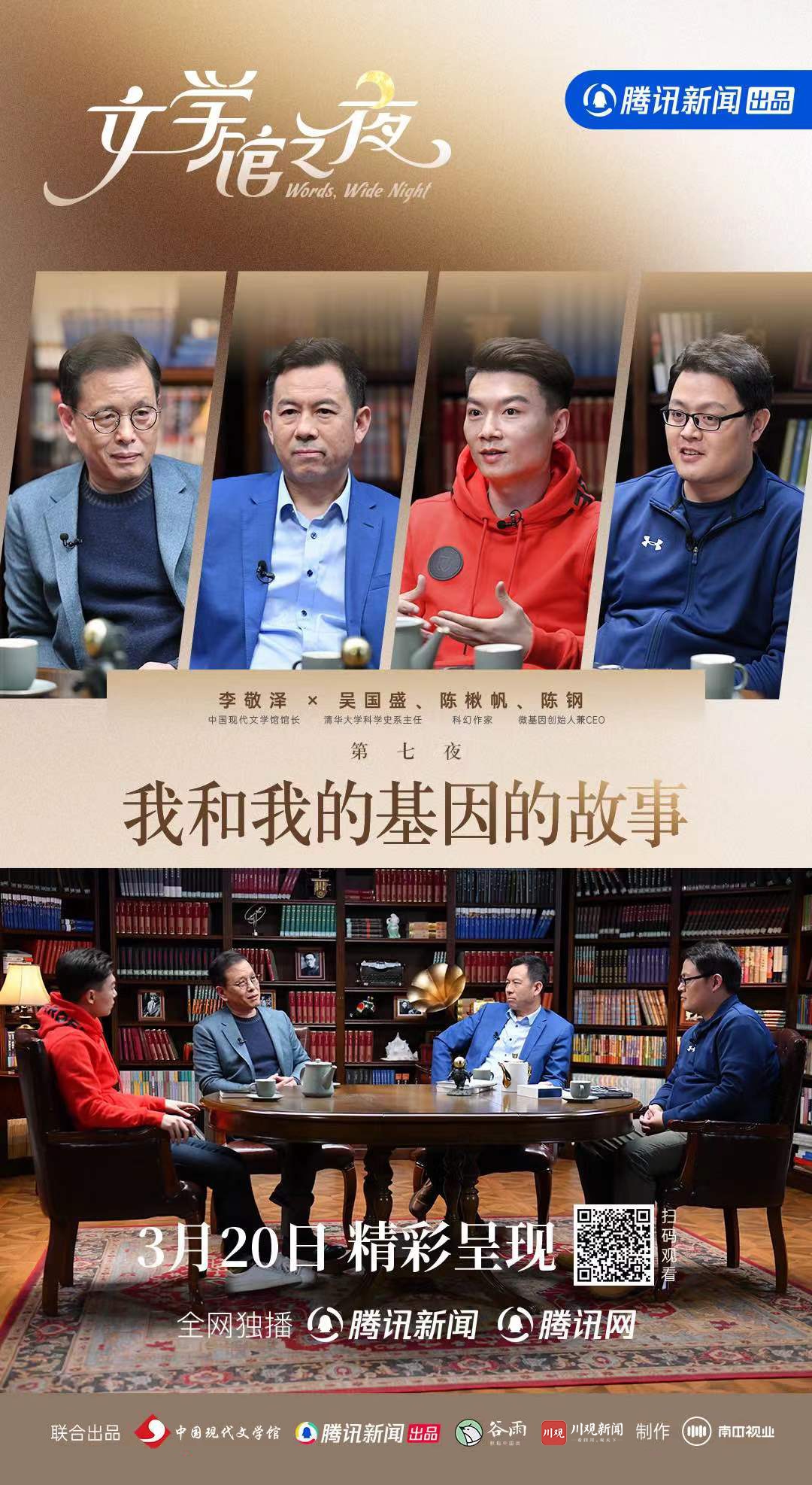 3月20日,由中国现代文学馆、腾讯新闻、谷雨和川观新闻联合出品的《文学馆之夜》第七夜《我和我的基因的故事》正式上线。中国作协副主席、中国现代文学馆馆长、作家李敬泽与清华大学科学史系主任吴国盛、科幻作家陈楸帆、微基因创始人兼CEO陈钢围绕“基因”展开畅想与畅聊。
