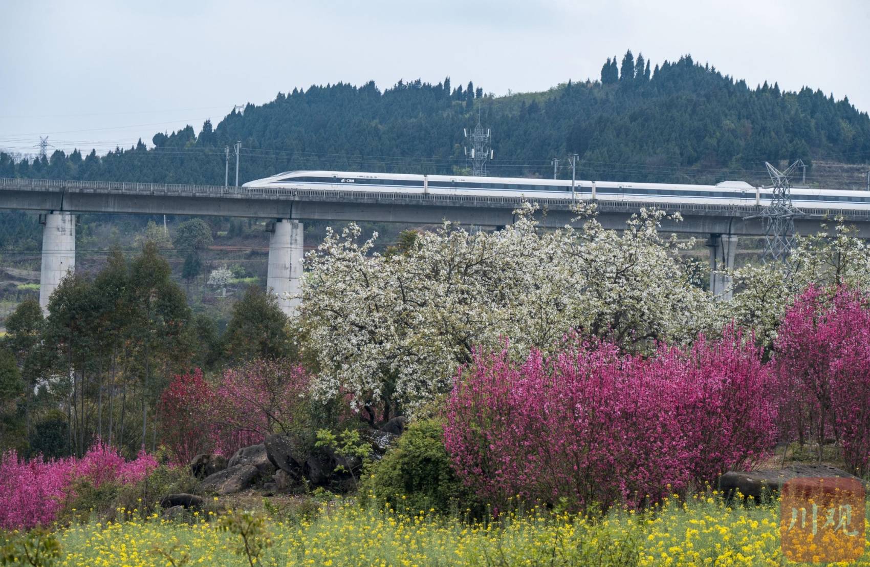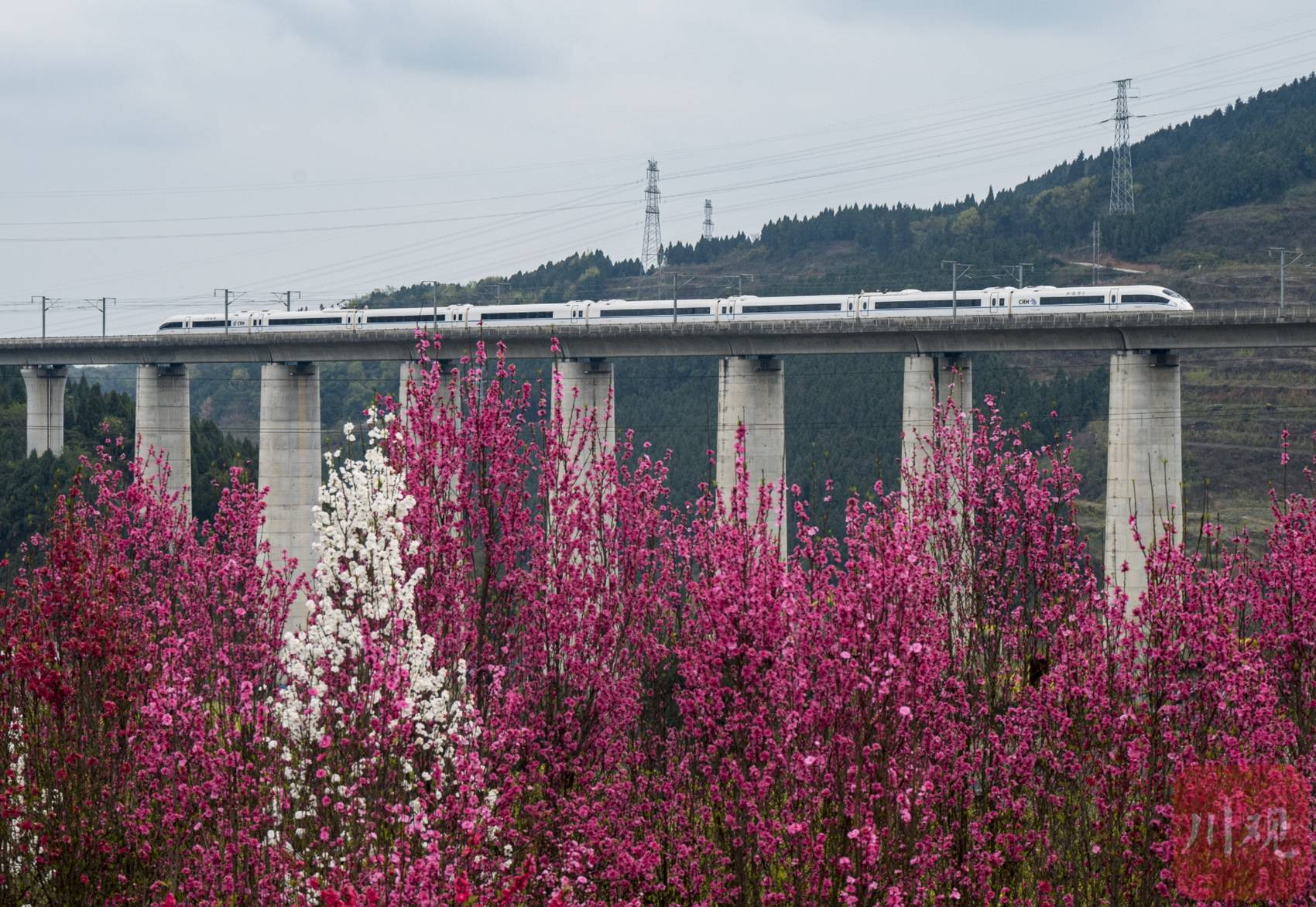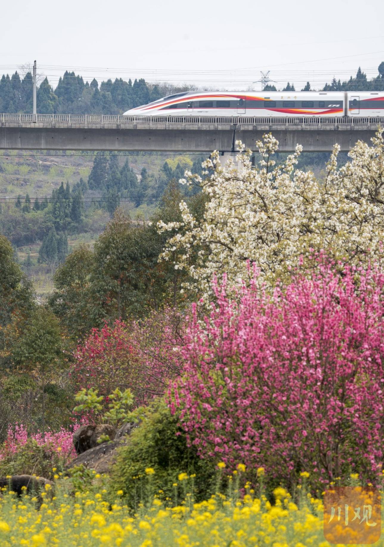 2023年3月21日,德阳市罗江区万佛村的天台山,漫山的桃花、梨花、油菜花陆续绽放,白的如雪、粉的似霞,每几分钟就有一列“和谐号”动车组,穿越青山和花海呼啸而来,这里已成为当地热门的春景打卡地。