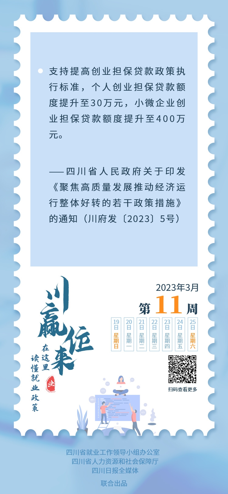 今年2月,为推动全省2023年经济运行整体好转,实现质的有效提升和量的合理增长,四川省人民政府印发《聚焦高质量发展推动经济运行整体好转的若干政策措施》。其中明确提出,“支持提高创业担保贷款政策执行标准,个人创业担保贷款额度提升至30万元,小微企业创业担保贷款额度提升至400万元。”