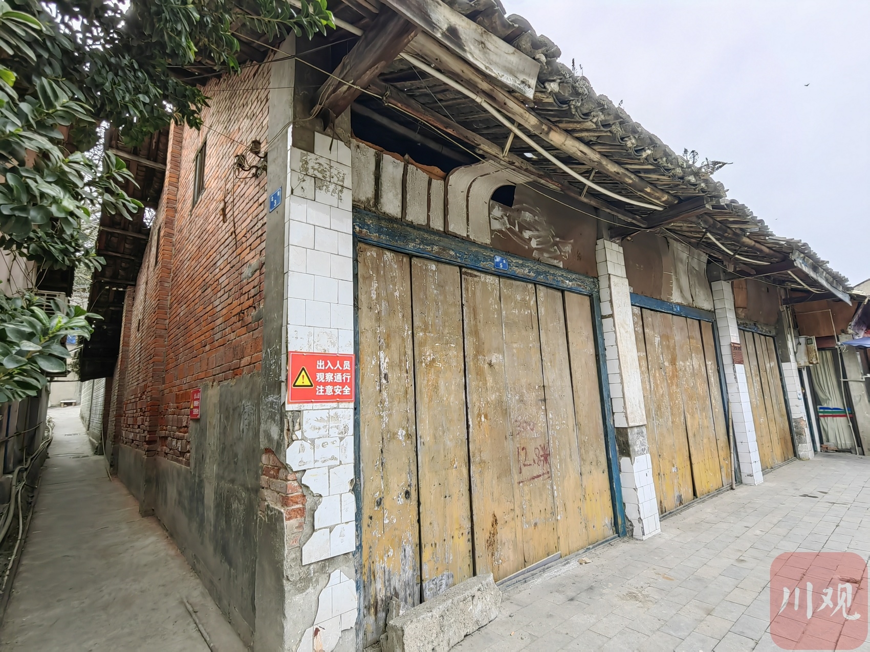位于二社区北大街5号的经营性自建房,三间铺面的木门紧锁。从门缝看进去,阳光从屋顶多处较大面积的破洞中洒下来。斑驳的外墙上,挂着红色警示牌“出入人员观察通行注意安全”。