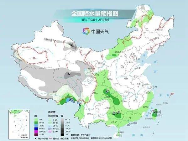 4月2日至4日,中东部将有一次大范围降水过程,西南地区东部、江汉、江淮、江南、华南以及黄淮等地有中到大雨,部分地区有暴雨;甘肃东部、宁夏、河北北部和内蒙古中东部等地有中到大雪或雨夹雪,内蒙古中部等地局地暴雪或大暴雪。
