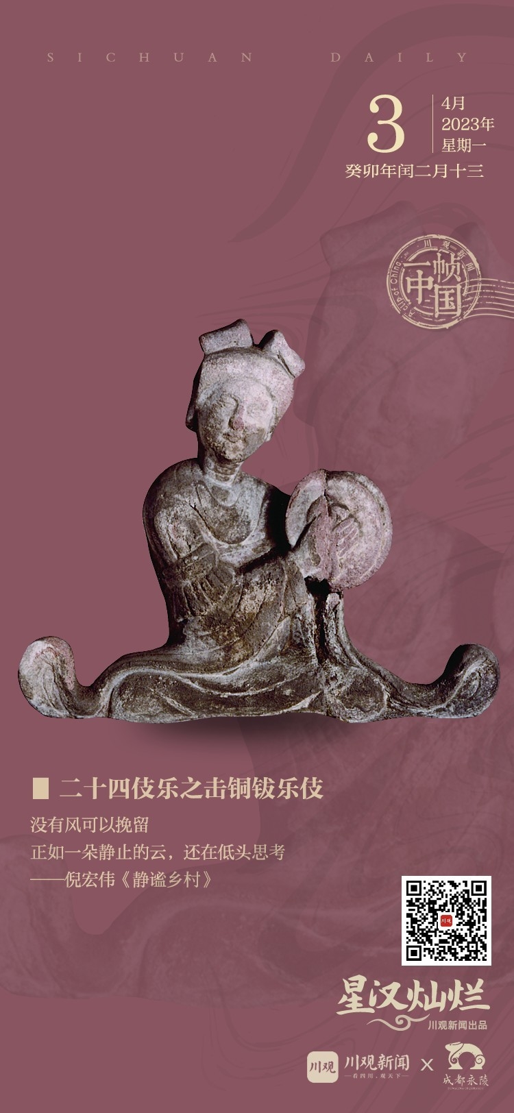 永陵击铜钹乐伎位于棺床西侧靠后的位置。乐伎身子微微左倾,铜钹举于左侧肩部位置。乐伎形象神情专注,似乎正在细细聆听自己手中铜钹的节奏之美。