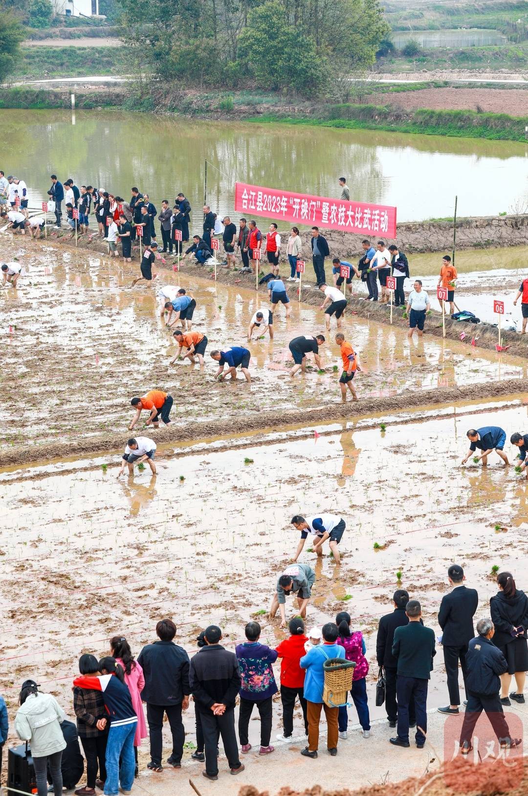 3月21日,泸州市合江县“开秧门”暨农技大比武活动在白米镇转龙湾村举行,选手在争先恐后比赛插秧。