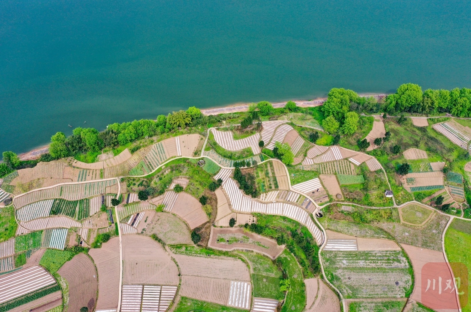 广安华蓥市明月镇竹河村代家嘴利用渠江滩涂发展起来的正在进行春播春种的蔬菜基地, 在碧绿的江水衬托下显得生机盎然。