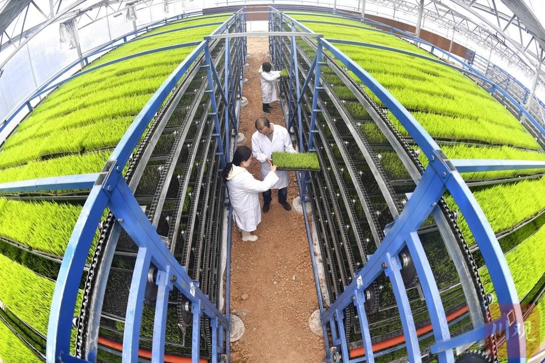 3月20日,广安市邻水县工厂化育秧中心的技术人员在观察水稻秧苗生长情况。
