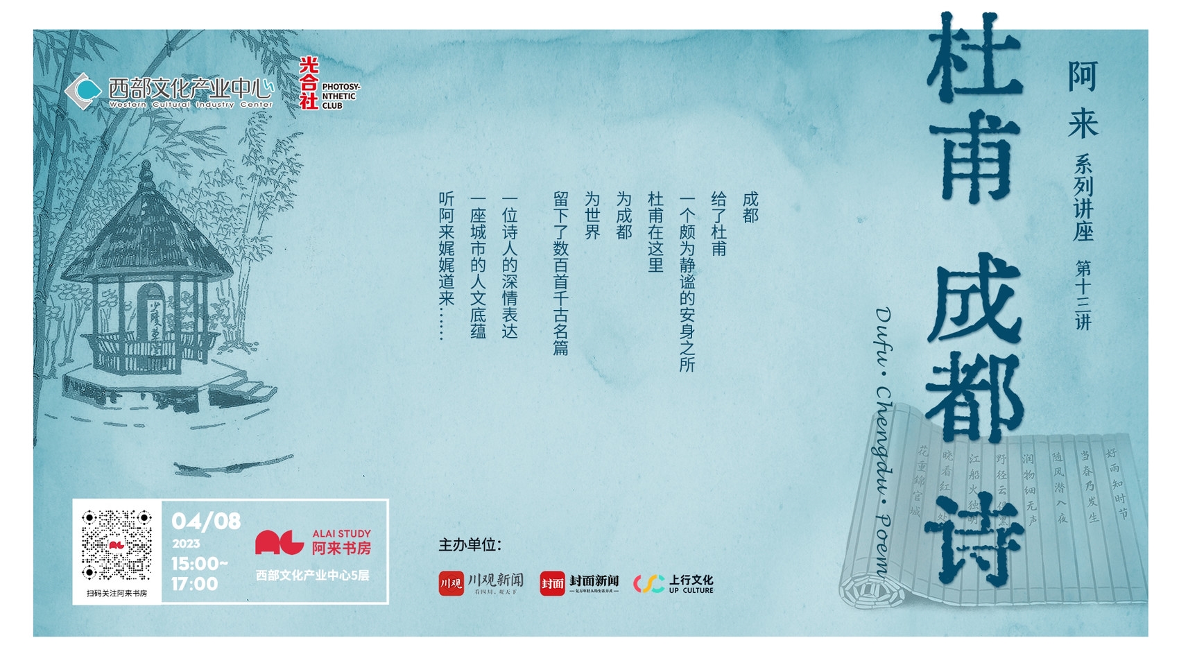 4月8日(周六)下午3点,由川观新闻、封面新闻、上行文化主办的阿来“杜甫成都诗”系列讲座第13讲如期而至。这一讲,阿来将以“绝句,仿得竹枝成别调”为题,详解绝句这种诗体例的开创传承,赏析杜甫绝句的诗义和诗艺。