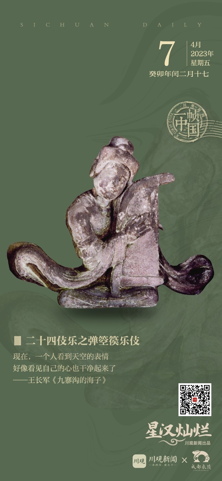 弹箜篌乐伎位于永陵棺床西侧中段。乐伎竖抱箜篌于胸前,头部略向左倾,脸面贴近竖箜篌,双手从两面拨动琴弦。翻飞的衣袂、凝神演奏的情态栩栩如生。