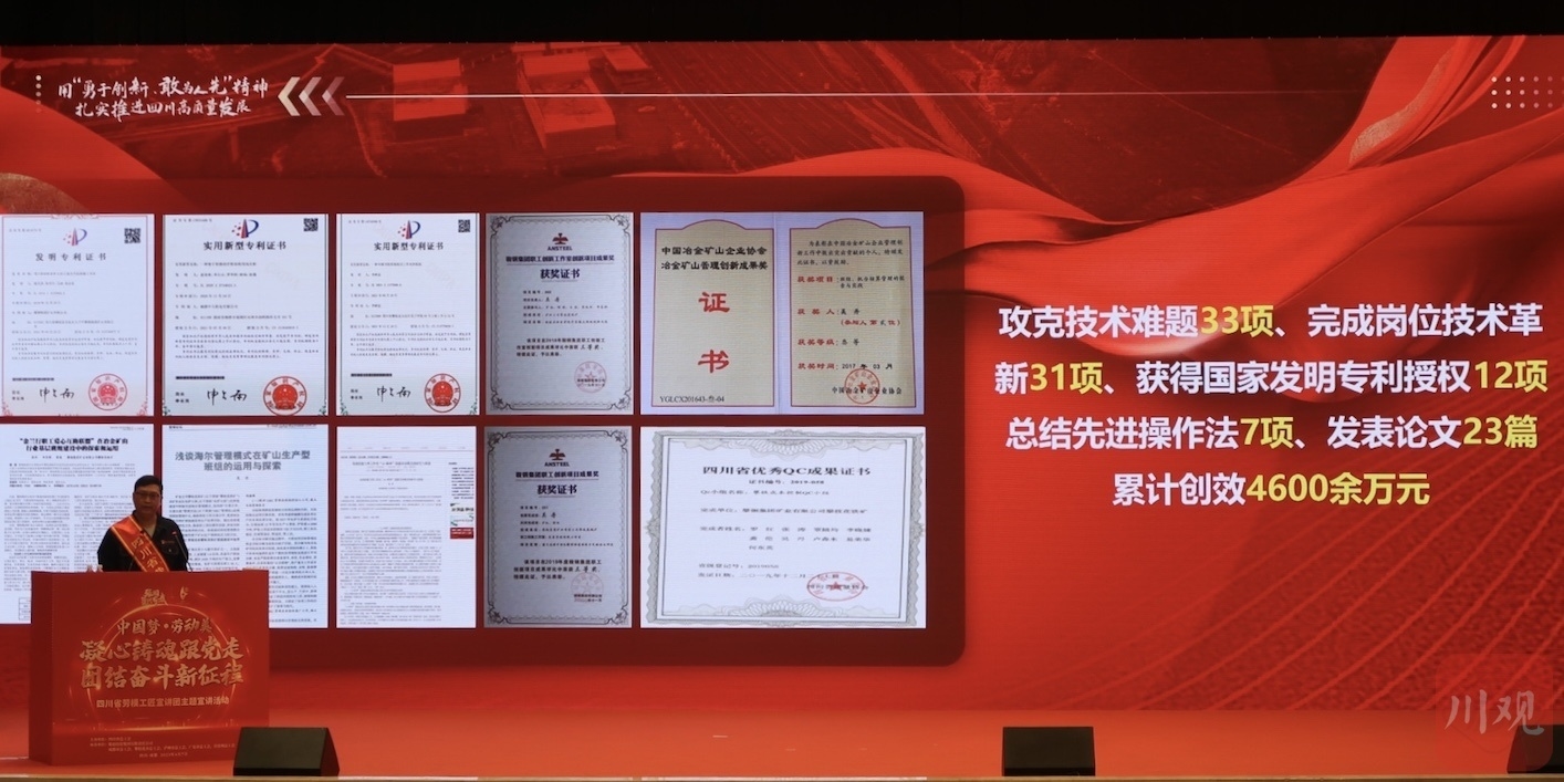 “全国冶金矿山行业技术能手”“四川工匠”“四川省技能大师工作室”“四川省劳模和工匠人才创新工作室”……台上的吴丹介绍着自己一路以来取得的成绩,台下,他的女儿充满自豪和骄傲地看着父亲。