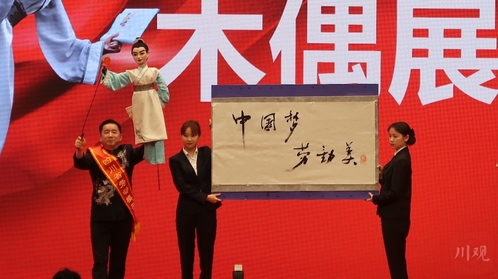 资中县木偶剧团团长胡海,手举木偶在舞台上写下“中国梦 劳动美”,给台下职工群众进行了一场木偶展示。