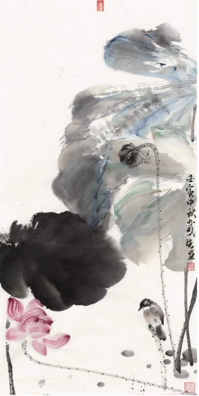 本次展览呈现了戴晓大量荷花题材水墨作品。四川大学艺术研究院院长、四川省美协副主席黄宗贤表示,在戴晓看来,荷最能表达他对生命情态的感悟,也就是说他借荷来抒写感时忧世的情怀,以此作为生命自觉意识体现。“他以荷为载体、以水墨为媒介,在酣畅淋漓地弹奏他心中的生命之歌。”黄宗贤认为,如果说戴晓画作中千姿百态的荷,是他关于对生命情态与意义思考的视觉表达,那么,他画荷系列中时常出现的小精灵——飞动的鸟,则是自我的隐喻:一个以灵动之眼观看世界的生灵,又是在自在中被观看的鲜活生命。