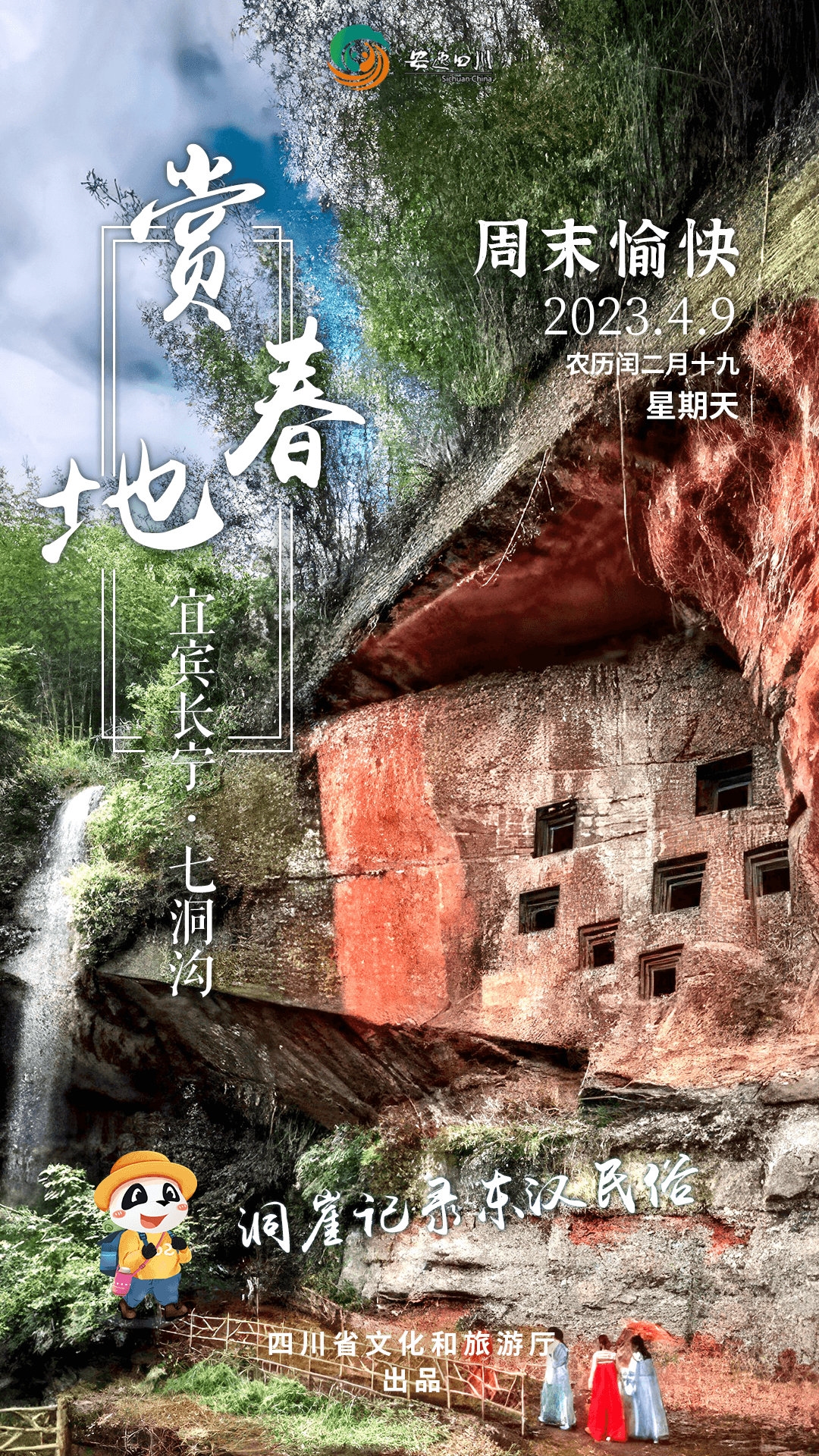4月9日,星期日。今日安逸四川日历海报赏春之旅走进宜宾长宁七洞沟景区。
