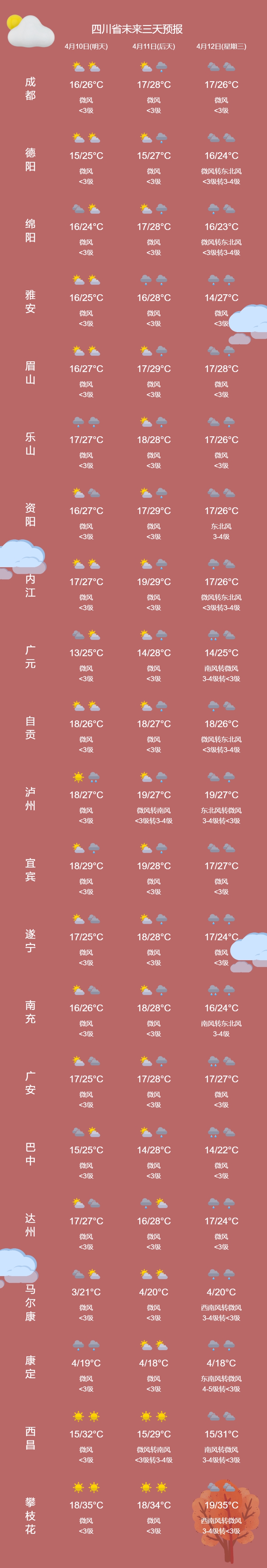 10日白天到晚上:盆地大部多云,西南部、南部有阵雨或雷雨,其中泸州局部中雨;甘孜州南部多云间阴天有分散阵雨(雪),川西高原其余地方多云间晴,攀西地区晴间多云。