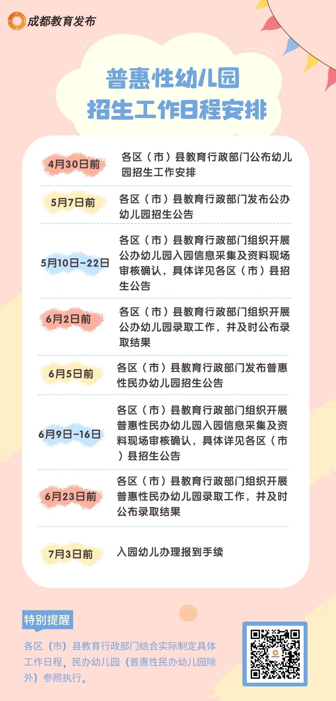 日前,成都市教育局印发了《关于做好2023年幼儿园招生入园工作的通知》,要求各区(市)县结合实际制定本区域公办和普惠性民办幼儿园招生办法,及时向社会公开公布。