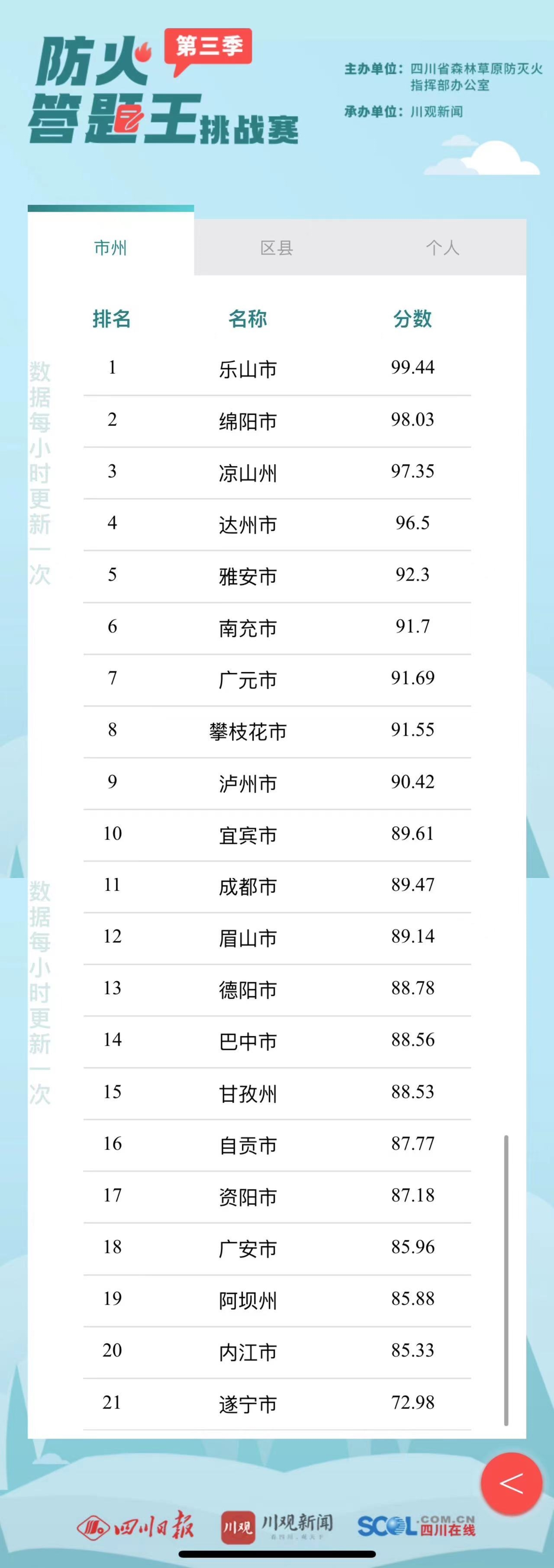 活动第一周即以冠军姿态亮相市州榜的乐山市,一度排名下滑,但在活动最后1小时异军突起重新登顶,拿下市州榜第1名。在活动第二周一口气从第12名跃升至第2名的绵阳市,活动结束时以不到1.5分的微小差距,紧随乐山市名列市州榜第2位。一直名列前茅的凉山州成为市州榜季军。
