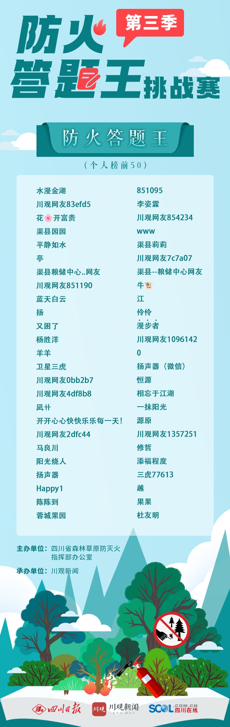个人榜单是所有参与用户最为关注的榜单,川观用户“水漫金湖”、“851095”、“川观网友83efd5”等50人,几乎坚持每日挑战赛,且与家人、朋友协同作战,最终获得防火“答题王”奖。川观用户“最早的早安Y.”等50人获得防火答题卫士奖;川观用户“川观网友龍飛123”等100人获得防火答题优秀奖。同时,还有众多网友在挑战赛中,获得了包括消防四件套、川观新闻系列文创品在内的抽奖奖品。