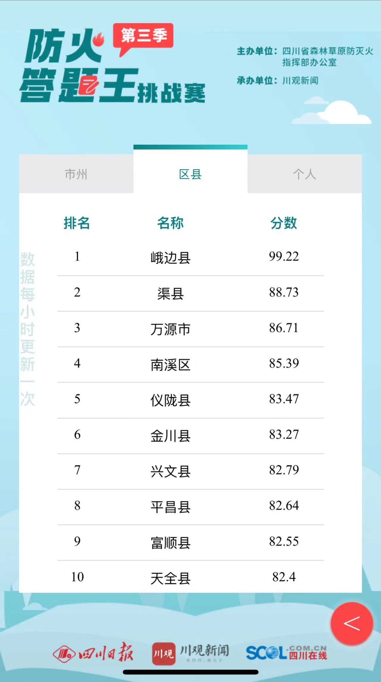 你追我赶的市州、区县角逐,互不相让的“答题王”争夺,4月10日24时,持续40余天、超过500万人次参与的第三季防火“答题王”挑战赛落下帷幕,一起来看看最终榜单!
