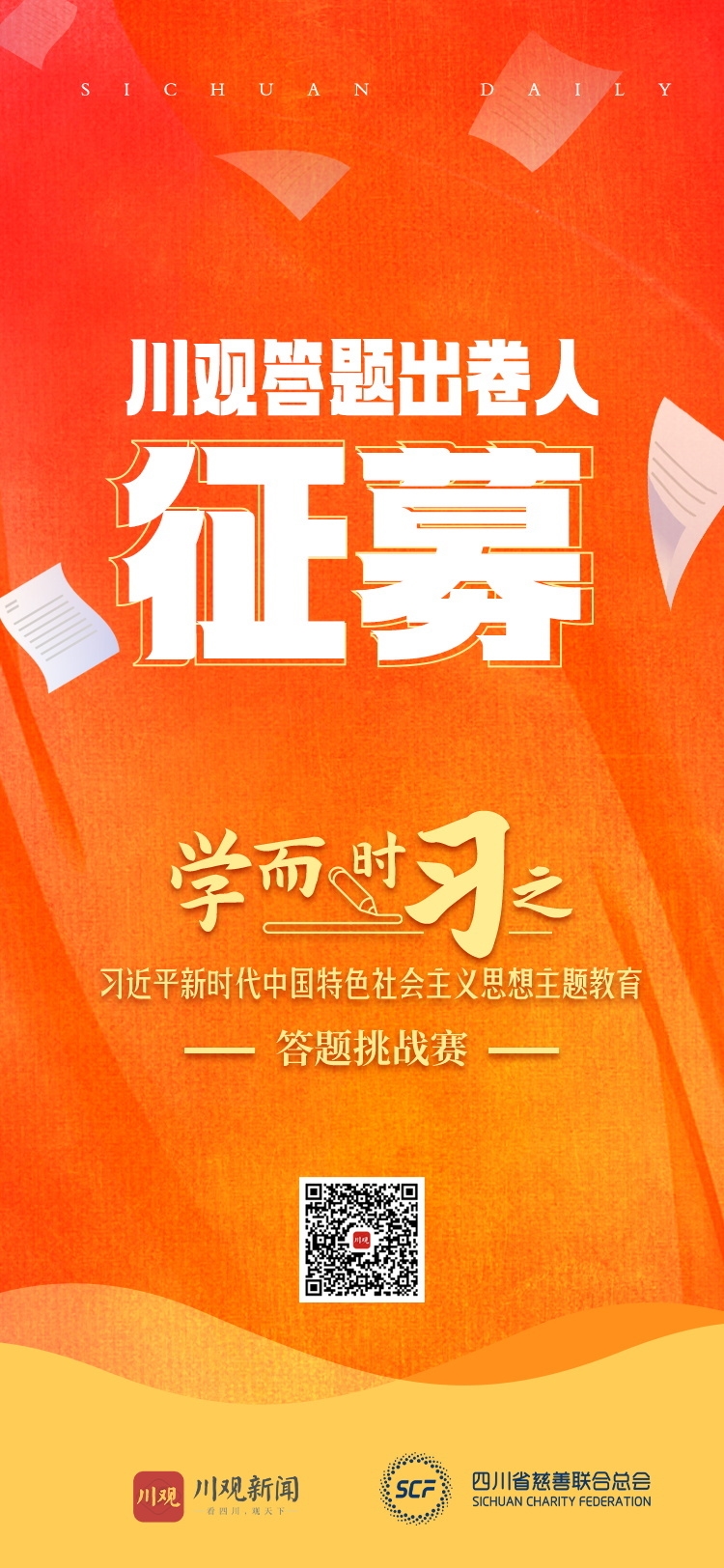 即日起,川观出题官征募令正式发布,“学而时习之”习近平新时代中国特色社会主义思想主题教育答题挑战赛面向全国公开征集知识答题,期待每个出题官的倾情加入。