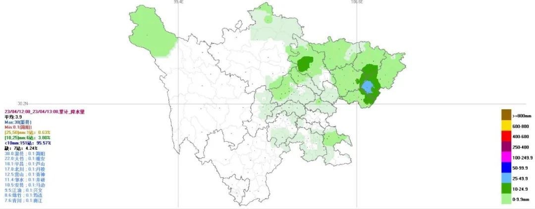 昨天08时到今天08时, 盆地大部阵雨,西北部、东部部分地方中到大雨,个别地方大雨,高原、攀西大部晴,甘孜州西北部、阿坝州东北部个别地方阵雨(雪)。盆地最低气温,东北部沿山14到16度,其余地方17到20度,最高气温,盆地东部20到23度,西部、南部27到30度。