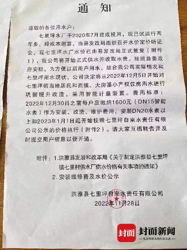 洪雅县七里坪自来水有限公司一名负责人告诉记者,七里坪水厂原来属于开发商金杯公司,2018年在当地政府的指导下,收购了该水厂,目前投资已经接近一个亿。“我们是根据2015年四川省发改委《关于放开水电气工程安装及检查维修价格的通知》,在合理情况下,可以自由调节收费。这个1600元不是换表的钱,而是水表前的管网包括水表,我要对你终身维护,这有个到达成本。”
