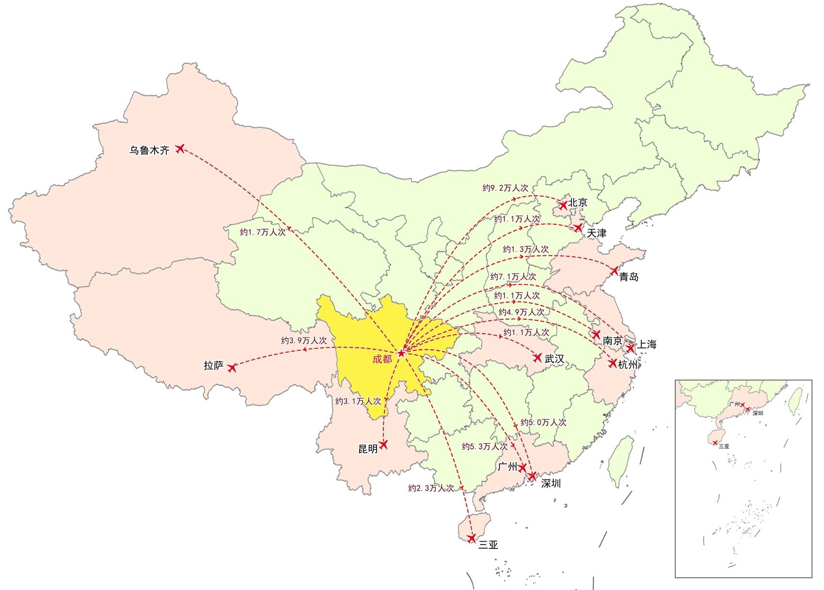 从繁忙航线看,主要集中在成都—北京、成都—上海、成都—广州、成都—深圳、成都—杭州、成都—拉萨、成都—昆明、成都—三亚、成都—乌鲁木齐、成都—青岛等。
