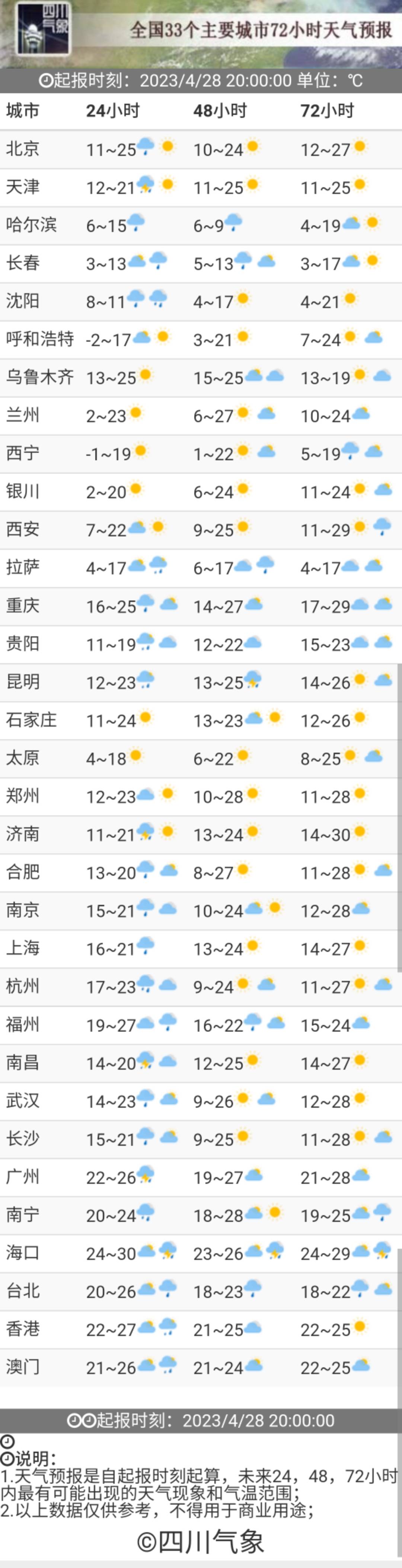 根据预报,今天晚上,雅安、乐山、眉山、自贡、宜宾、泸州6市以及盆地西部山区还有小雨,局部中雨。不过,不要担心,这些地方的雨今晚基本上都会停。4月29日白天至5月3日白天,四川的天气看起来挺不错的↘↘↘