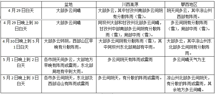 四川省气象台今天(4月28日)下午发布最新天气预报:4月29日至5月3日,四川省大部以阴天间多云天气为主,盆地部分地方有阵雨,主要出现在早晚,川西高原大部多阵性降水,攀西地区前期有阵雨,其余大部时段以多云间晴的天气为主。天气总体较好,盆地白天体感舒适,适宜外出旅游和户外活动。