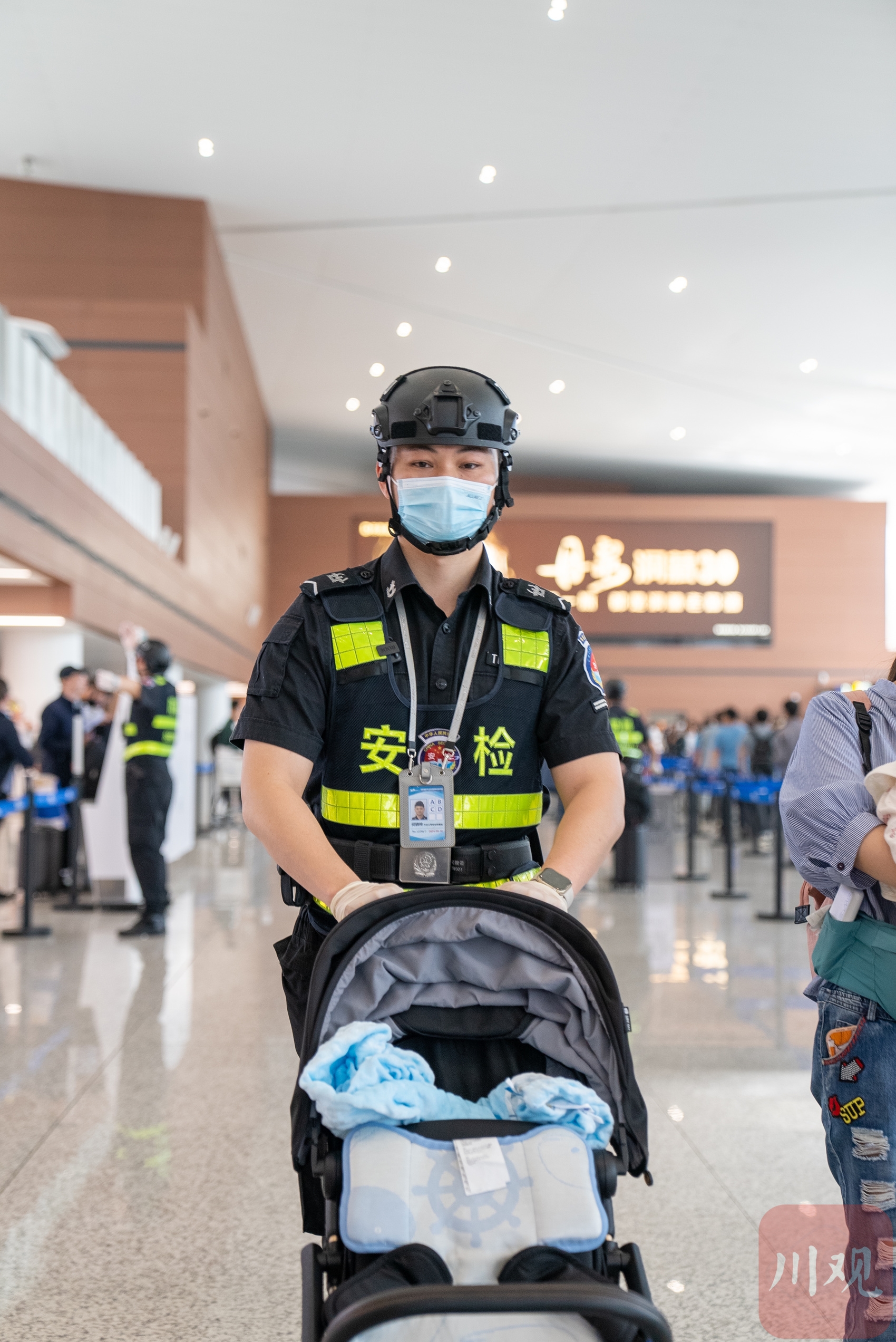 4月27日,成都天府国际机场安检站引导员何骁帅正在帮助旅客。