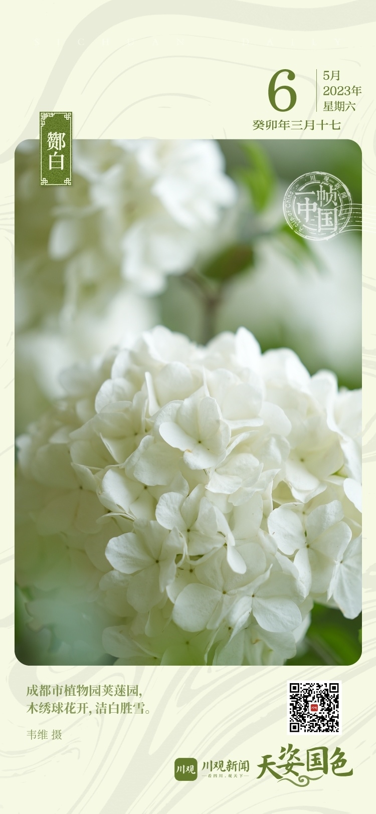 白色的绣球花同样呈现出酂白之色。开花时白花满树,犹如积雪压枝,十分美观。当然,木绣球花与酂白还有另一相似之处,就是醉人,团团簇簇的美是否也曾令你流连?