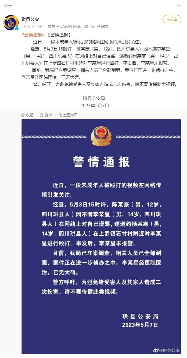 据@珙县公安,珙县公安局5月7日发布警情通报称,近日,一段未成年人被殴打的视频在网络传播引发关注。