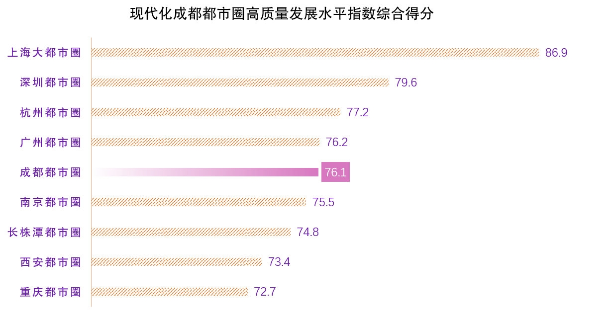 先看横向对外的“发展水平指数”。成都都市圈综合得分为76.1,排名第5,处于中西部领先地位,同城化水平优势突出,属于特色发展型都市圈。排名前4的分别是上海、深圳、杭州和广州都市圈。
