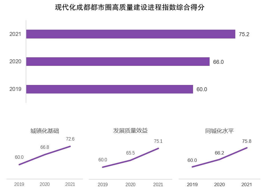 再看纵向对内的“建设进程指数”。该指数采取2019—2021年成都都市圈全域数据进行发展比较,3年来综合得分持续提升,增速均在10%以上,总体呈现出三个特点。“城镇化基础稳步提升,发展质量效益、同城化水平2020—2021年进展提速,成都都市圈高质量建设实现聚力起势。”卢庆强说。
