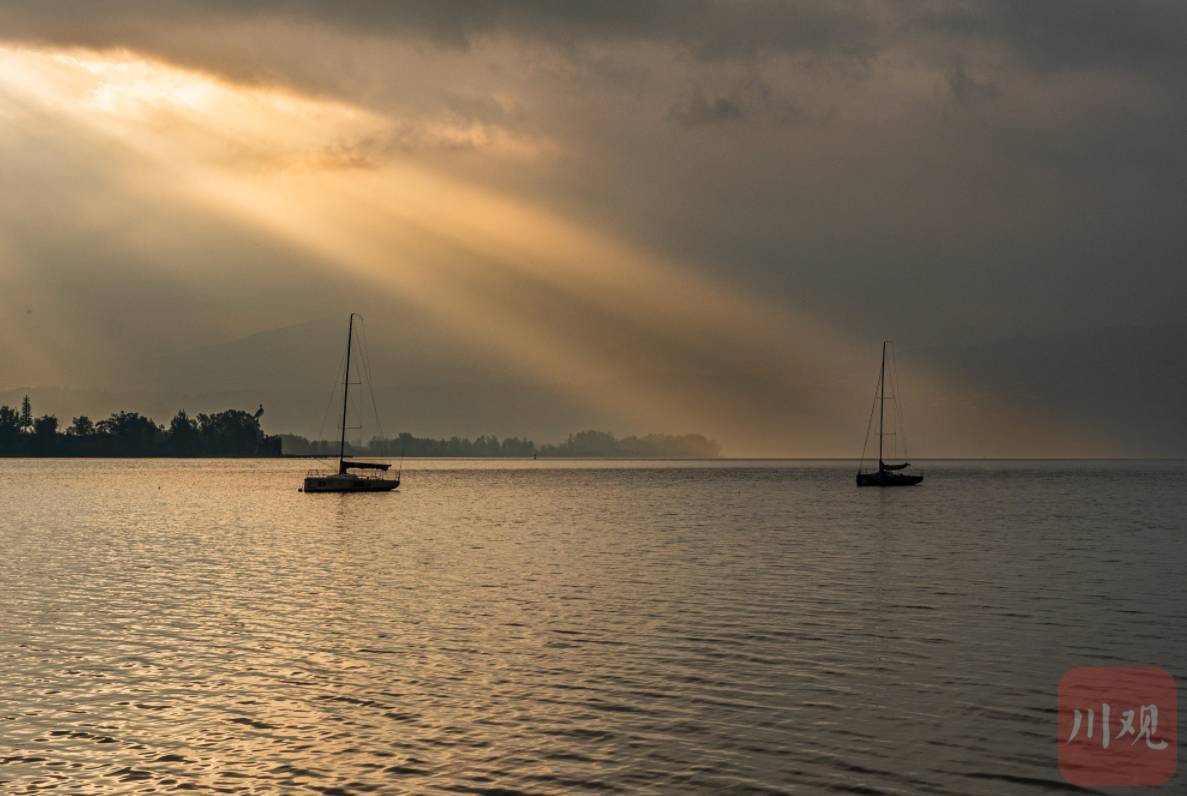 5月16日清晨,雨后的凉山州西昌市邛海国家湿地公园上空出现“丁达尔效应”,阳光从云隙中倾泻而下,仿佛有了形状,光瀑一般,照亮湖面。