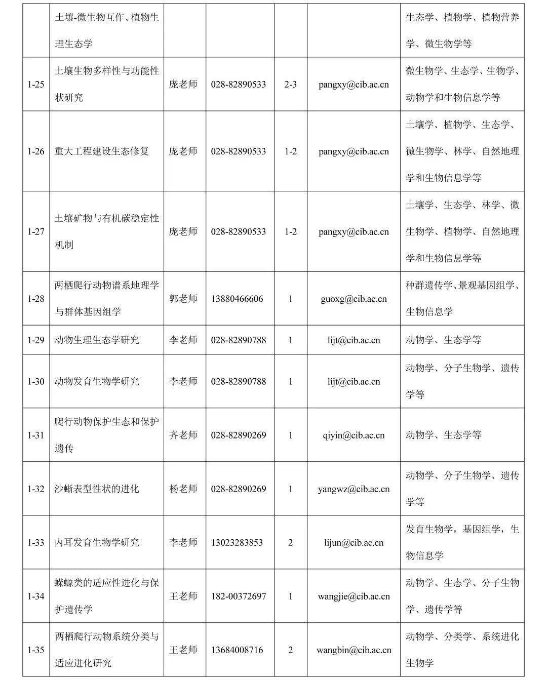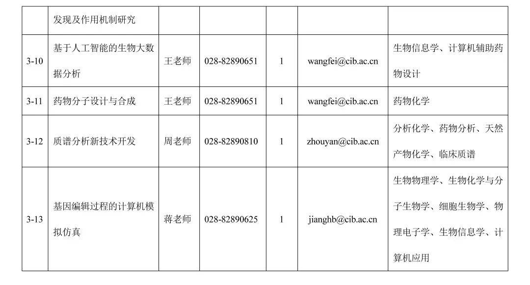 根据合作导师提交的招聘计划,成都生物所将在植物学、动物学、微生物学、生态学、环境科学、药物化学、药理学等领域招收博士后研究人员。