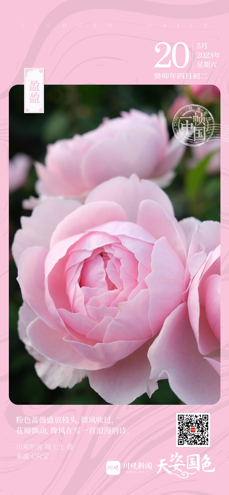 五月的花海中就有盈盈的粉色蔷薇,花瓣层层包裹构成独特的层次美,花朵迎风摇曳又别有一种安宁的意境,似乎就这么在天地之间成双成对地站成永恒。