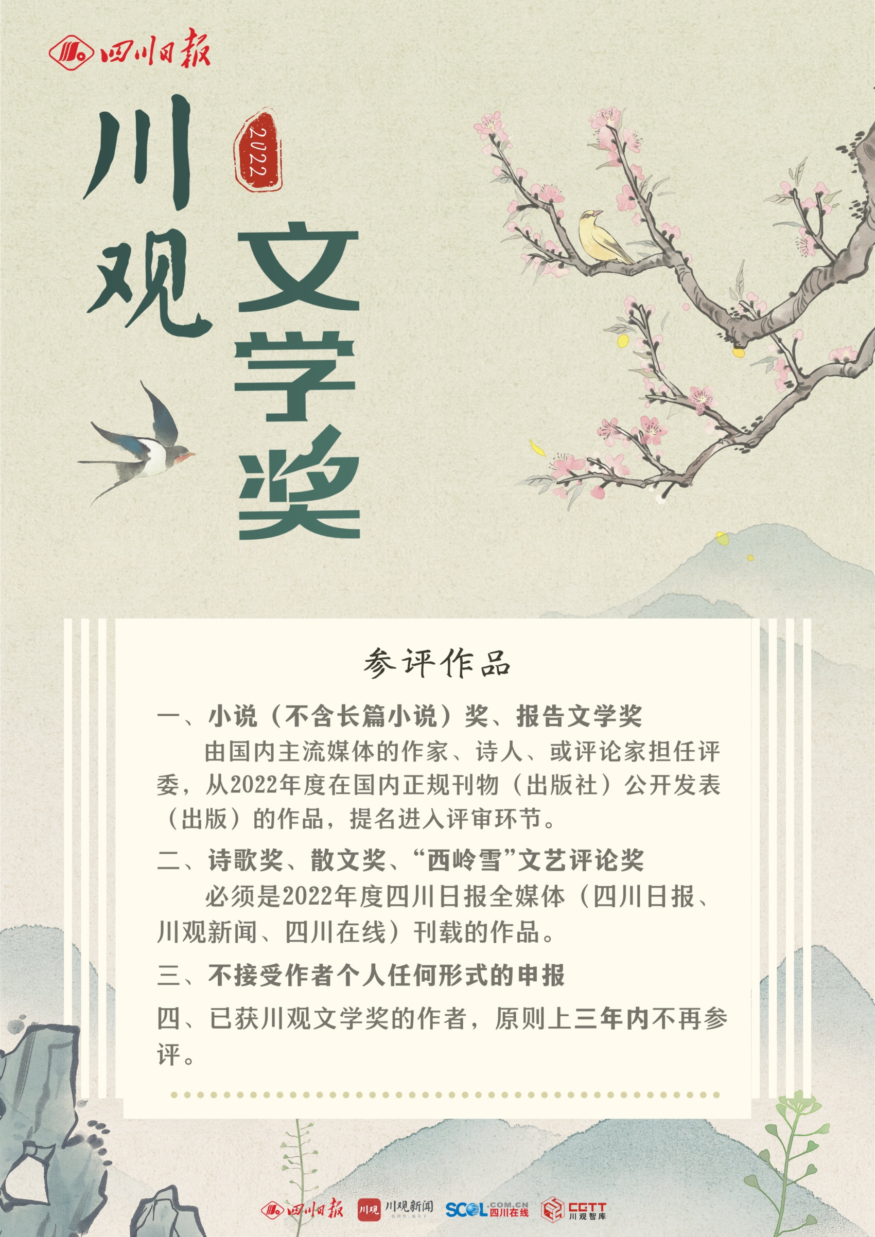 据悉,除了增设提名委员会外,本届川观文学奖还对参评作品来源做了更进一步的规定:小说奖(不含长篇小说)、报告文学奖参评作品,由组委会邀请国内主流媒体的作家、诗人、评论家组成的评委,从2022年度在国内正规刊物(出版社)公开发表(出版)的作品中提名;诗歌奖、散文奖、“西岭雪”文艺评论奖参评作品必须是2022年度四川日报全媒体(四川日报、川观新闻、四川在线)刊载的作品;不接受作者个人任何形式的申报。