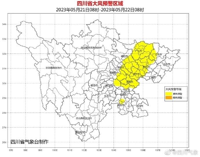 据四川气象:四川省气象台20日16时发布大风黄色预警:20日晚上到21日晚上我省大部有一次阵雨或雷雨天气过程,盆地东北部、西南部、南部有中雨,局地大雨到暴雨,阿坝州部分地方有中雨,局部大雨。21日早上到晚上,受地面冷空气影响,盆地自北向南将先后出现4-6级偏北风,其中广元、绵阳、德阳、成都、眉山、内江、资阳、遂宁、南充、巴中、宜宾11市的部分地方风力可达7级或以上。