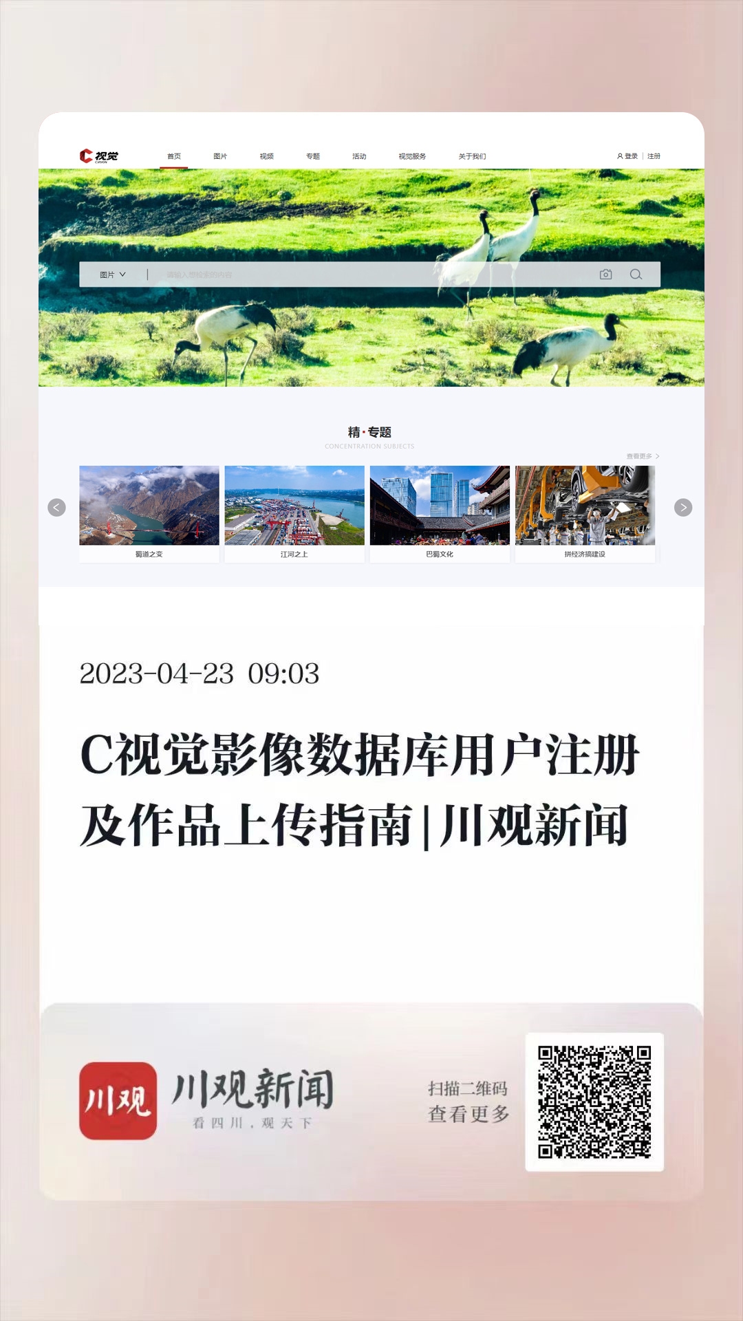 2023年4月23日, C视觉影像数据库正式上线。数据库秉承“共建、共创、共享”的发展理念,以记录四川为使命,与全球影像创作者同行,致力打造四川影像作品资源最丰富、主题分类最齐全、数据管理最先进的影像数字化服务平台。