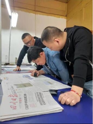 (《四川日报》印刷质量评审小组的评审员们正认真审核1、2月份南充、泸州、达州和凉山4个分印点选送的24张《四川日报》)