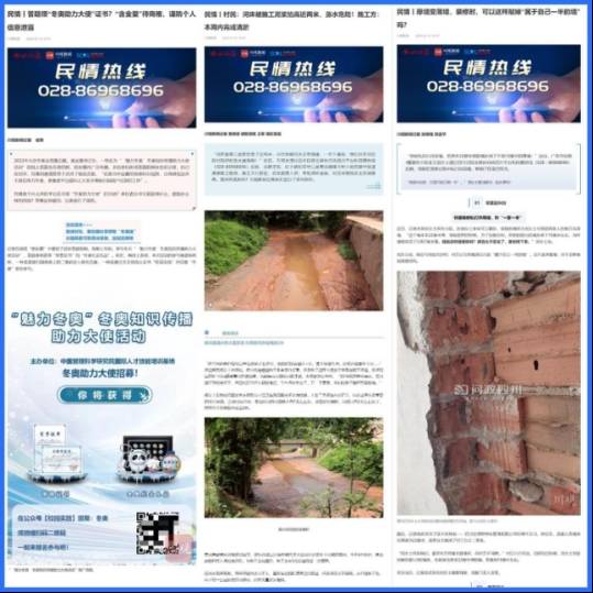 充分用好“民情热线”平台,推出《民情丨网友:不方便,这地方交通往来靠渡船 渠县交通运输局:新大桥已在建》《民情丨凉山悬崖村的脐橙寻买家,驻村干部带来这个消息》等融媒产品,跟踪报道各行各业民生动态。推出“健康四川”“应急与安全”“环保视线”等民生专题,刊发《2022年四川省30件民生实事亮点解读》《试行个人养老金 事关你我这些权益》等深度报道,反映群众建议呼声,回应群众诉求。