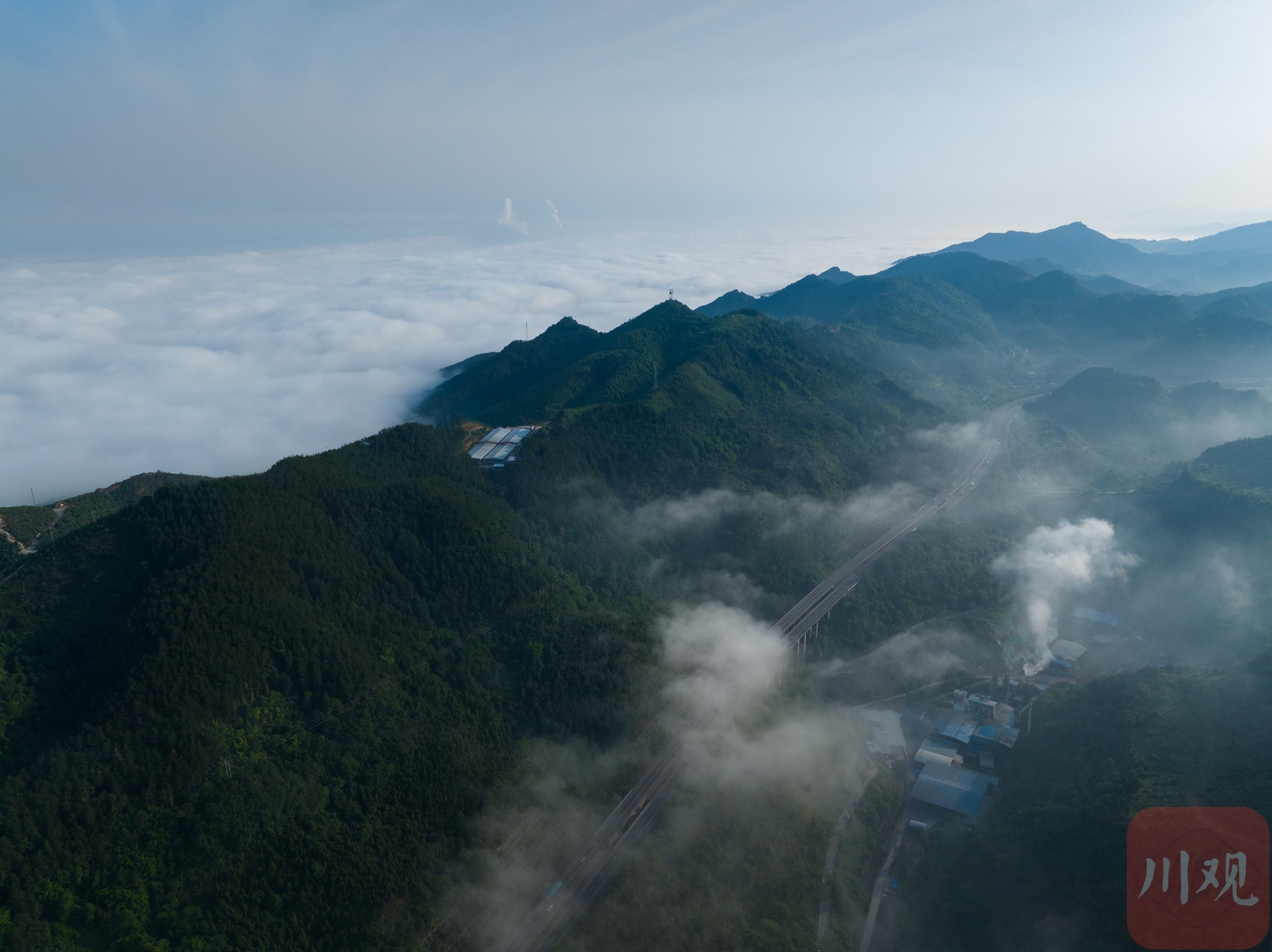 清晨,晨曦初露,华蓥山云海奔腾,高空俯瞰下的高速公路如同巨龙,穿过山间的一个又一个隧道,迎着云海在崇山峻岭间翻越。云雾笼罩下的城市原野,仿佛披了一件轻纱一般,如梦似幻。缓缓驶离的货运列车华蓥站出发,行驶在美丽的原野之中,迎着朝阳奔向远方,云海下的华蓥如同一幅浸润在水彩中的美丽画卷。