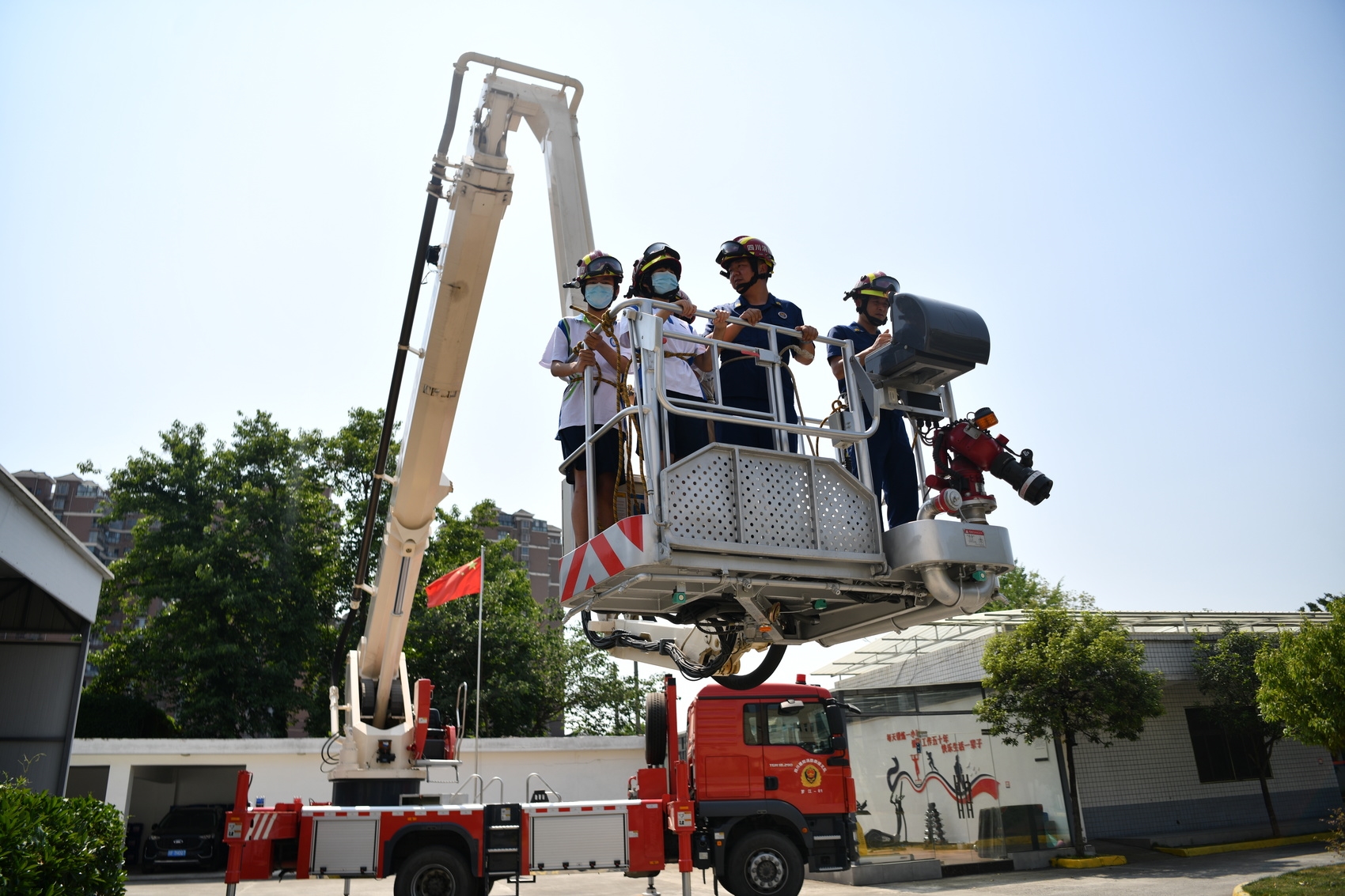 “叔叔,灭火器是怎么用的?”“叔叔,这辆消防车是怎样灭火的?”在消防大队,孩子们对消防车和消防器材很感兴趣,围着消防员问个不停。消防员带领着孩子们参观了消防车和器材装备,用通俗易懂的语言耐心解说每一类器材的名称、用途及使用方法,并进行操作示范,还指导孩子们穿上了厚厚的战斗服、孩子们坐上了登高平台车,当了一回 “小小消防员”。