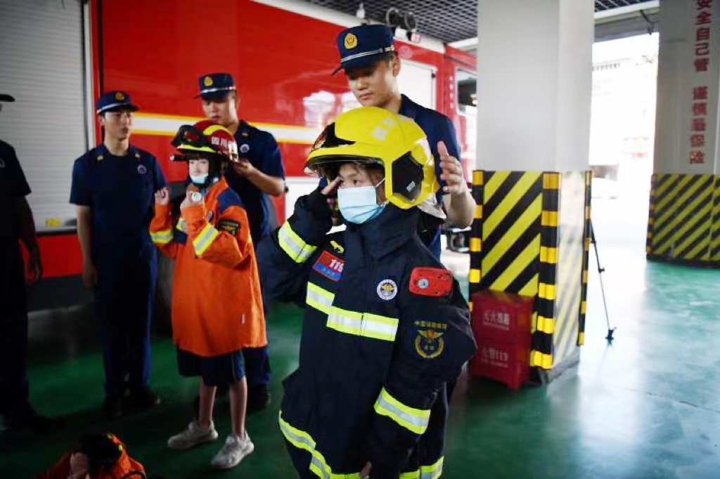 孩子们在消防员的帮助下体验当一回“小小消防员”。