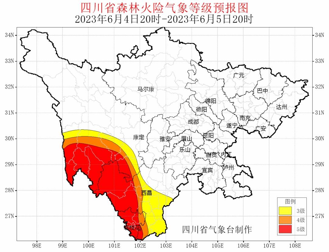 据最新气象资料分析:6月4日20时~6月5日20时,甘孜州南部和攀西地区西部南部以晴间多云天气为主,气温高、湿度小、风速大、空气干燥,大部地方森林草原火险气象等级为5级;6月5日20时~7日20时,攀西地区大部地方有阵雨或雷雨,西部南部有中雨,局地有大雨到暴雨,森林草原火险气象等级将降低,甘孜州南部和凉山州西北部森林草原火险气象等级为4~5级。请相关州市加强火源管理,做好森林防火工作。