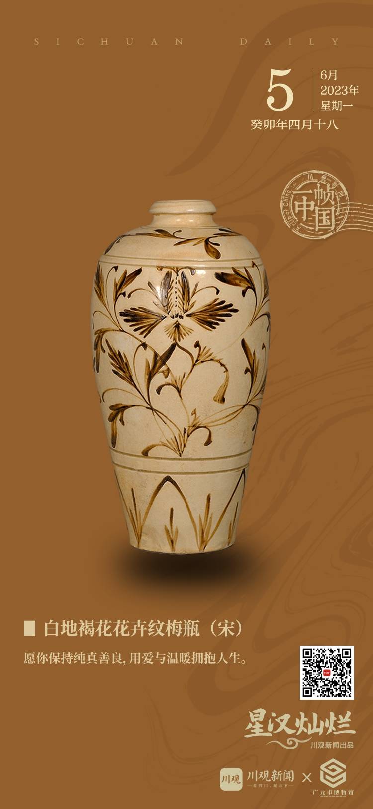 在广元市博物馆中展出有一对宋代的广元窑白地褐花花卉纹梅瓶,为国家二级文物。梅瓶小口厚沿,短颈溜肩,瓶身渐收,肩腹曲线过渡圆润自然,瓶身修长挺拔、器形饱满周正。器物通饰白釉,其腹部以传统水墨画技法绘制出黑色花卉,线条遒劲不失秀美,枝叶开阔舒展,花朵硕大,一气呵成,生动自然,豪无刻意造作气象,体现出宋代高贵典雅的艺术风格。